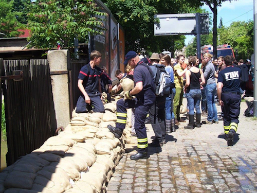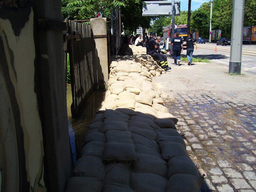 Vor Ort mussten wir die Strecke (von Antonstraße bis Alexander-Puschkin Platz) vor Überflutung sichern und mit tausenden von Sandsäcken verbauen.